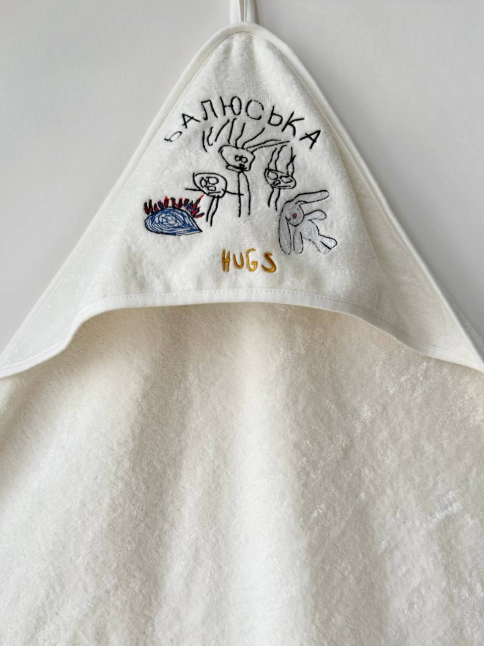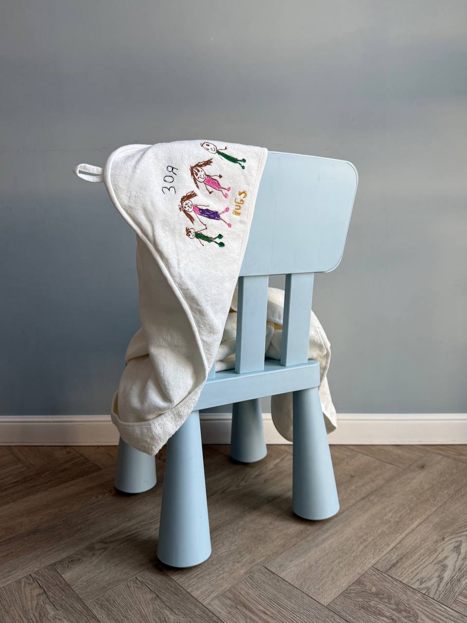 Полотенце 100x100 см с вышитыми элементами на уголке-капюшоне. Махровая часть с внутренней стороны отлично впитывает влагу, а велюровая внешняя часть дарит дополнительный комфорт. Упаковано в функциональный мешочек. Рекомендованный возраст: 0-8 лет.