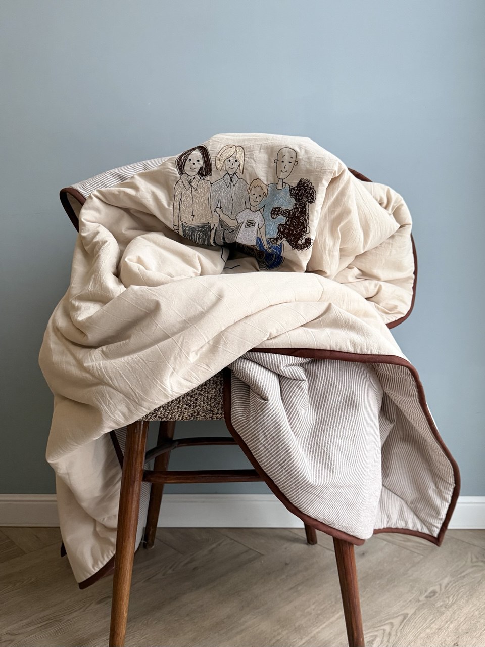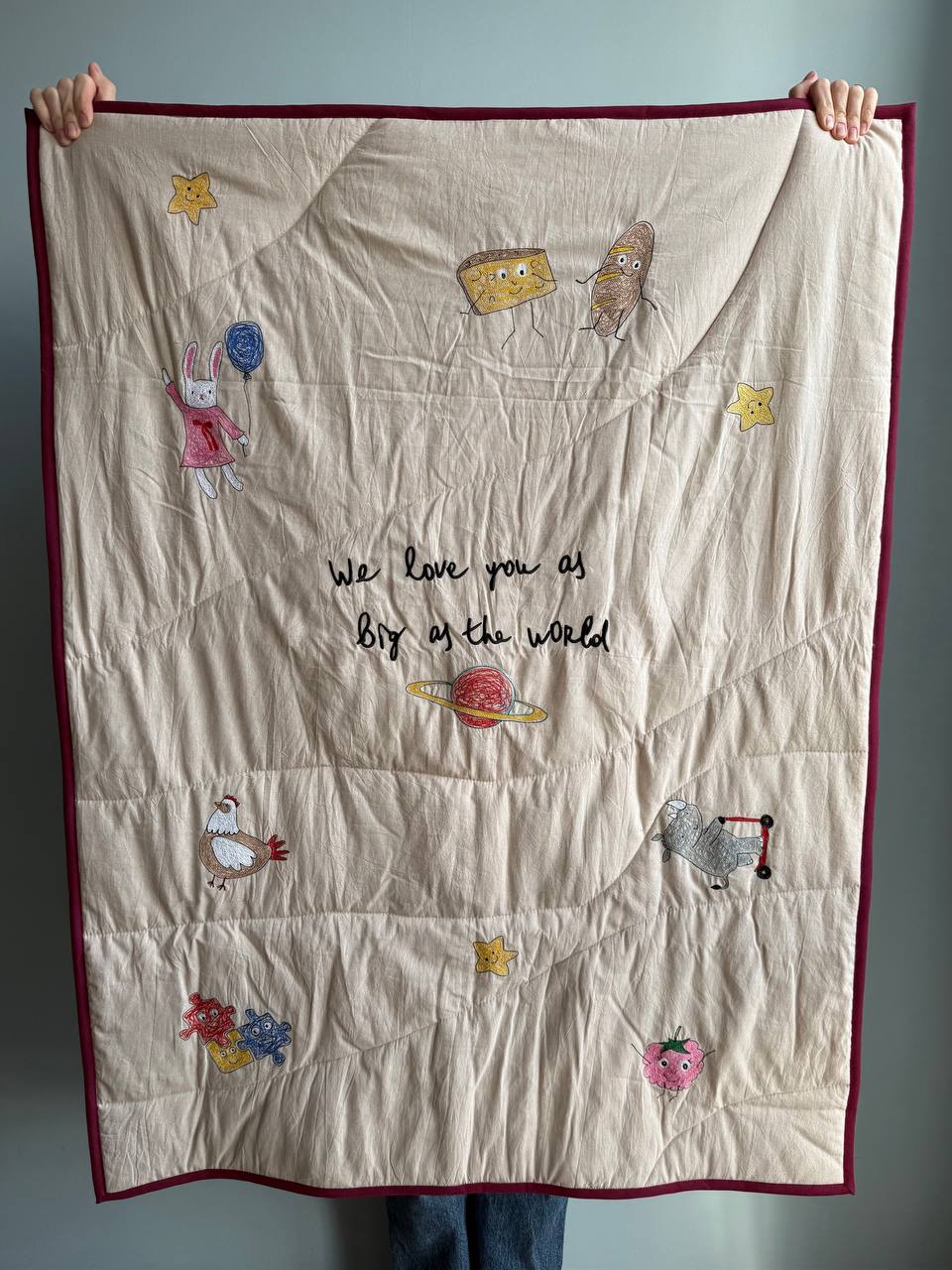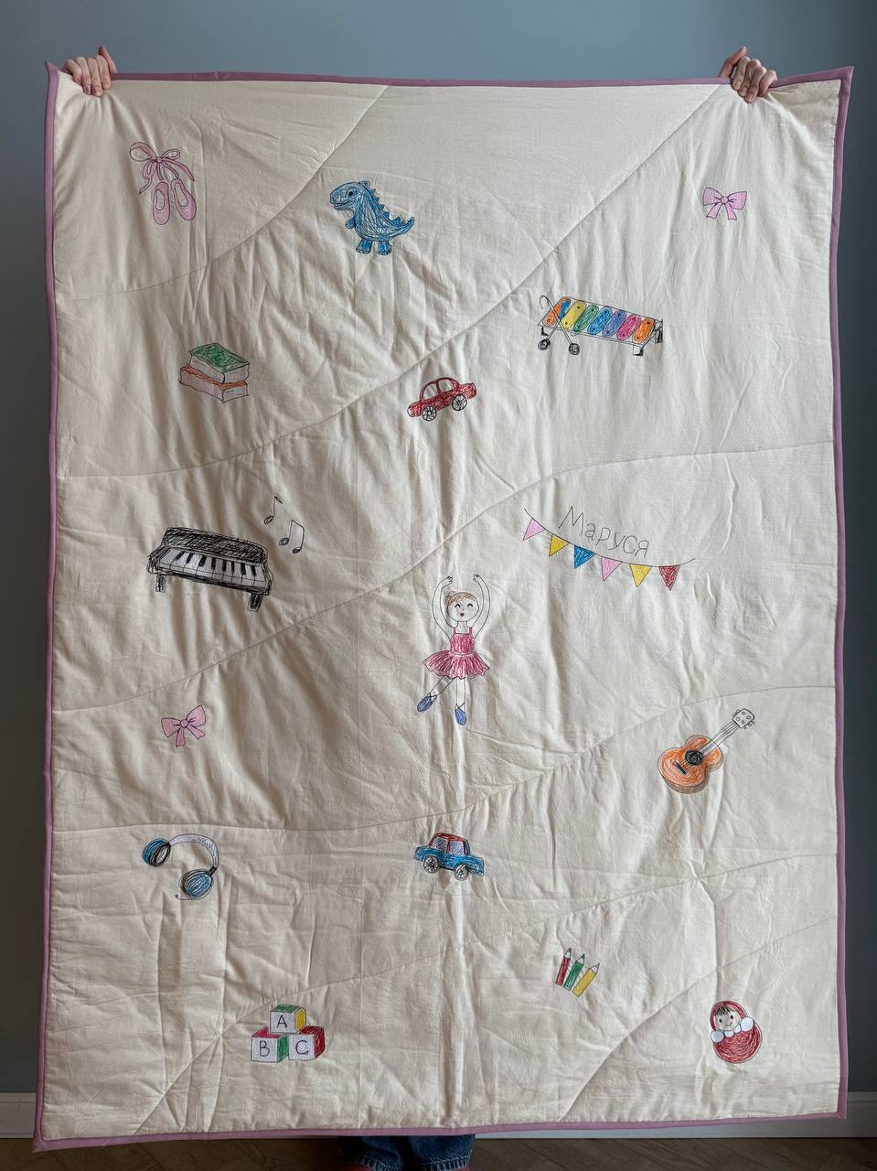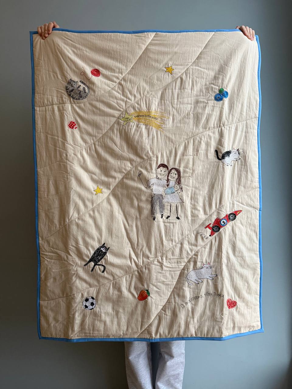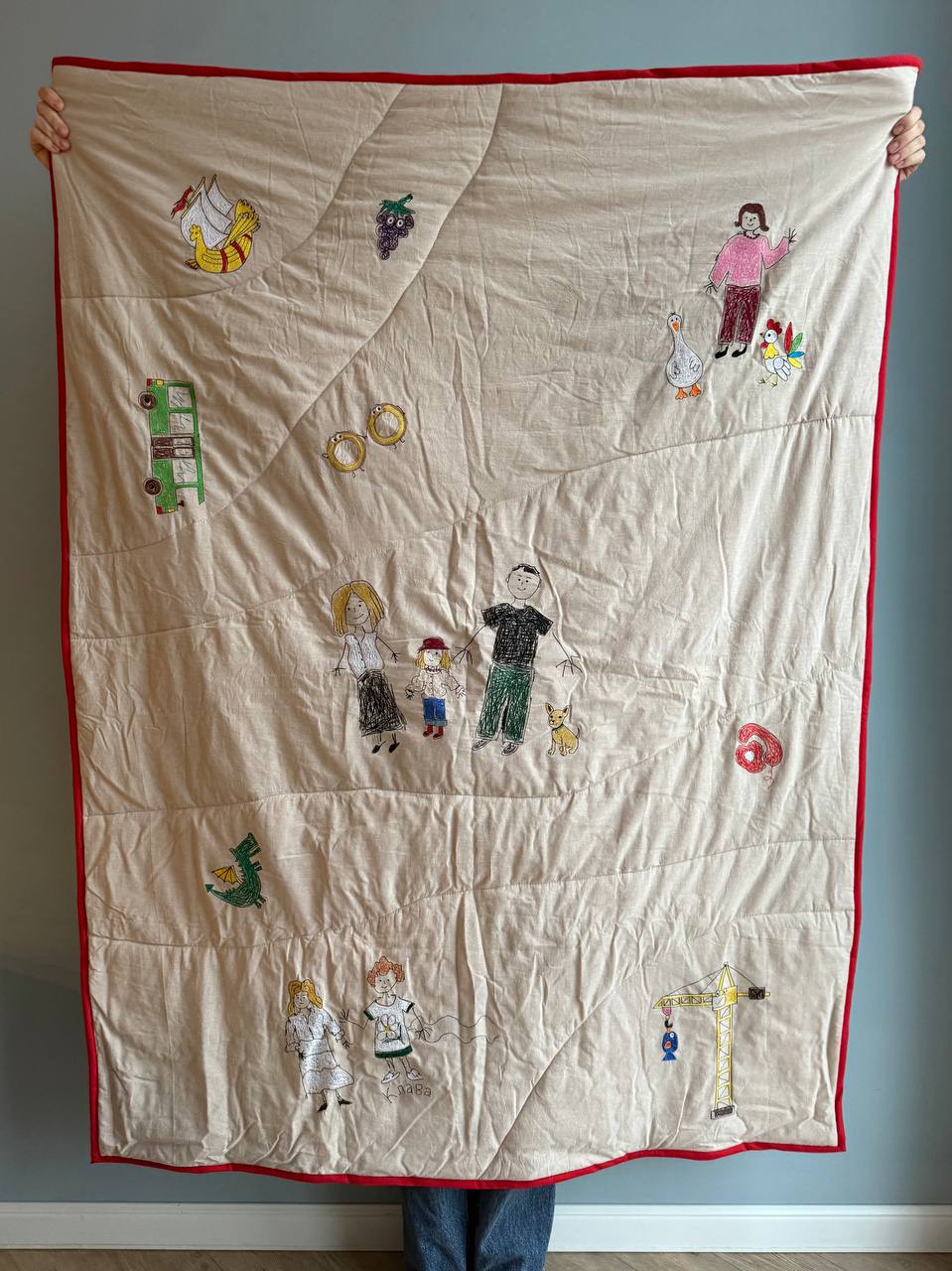 Так и родилась идея создать одеяло-плед с историей, в нём: пожелания от близких, рисунки от братьев и сестёр, дедушек и бабушек, послания от родителей — и всё это бережно вышито.