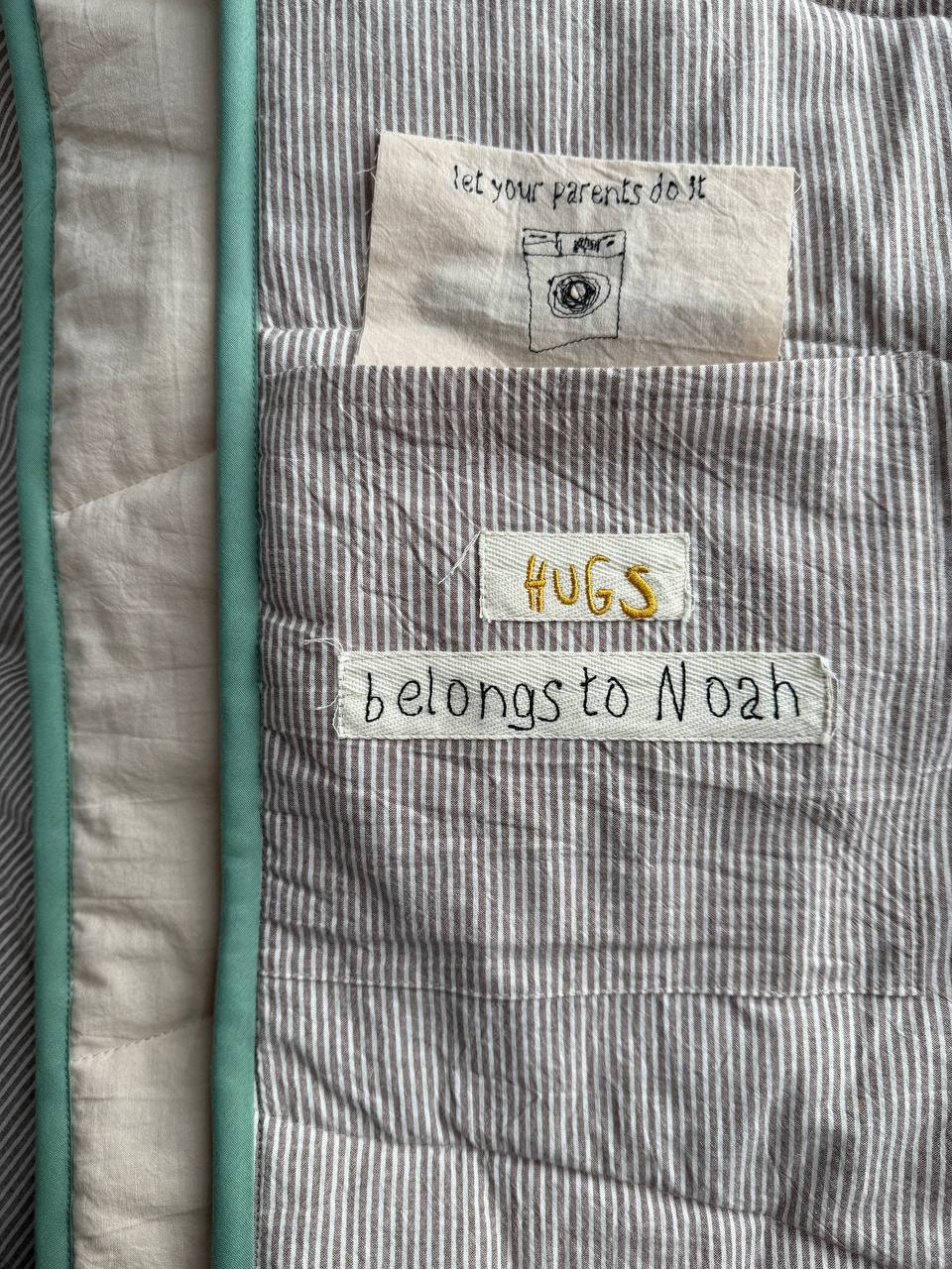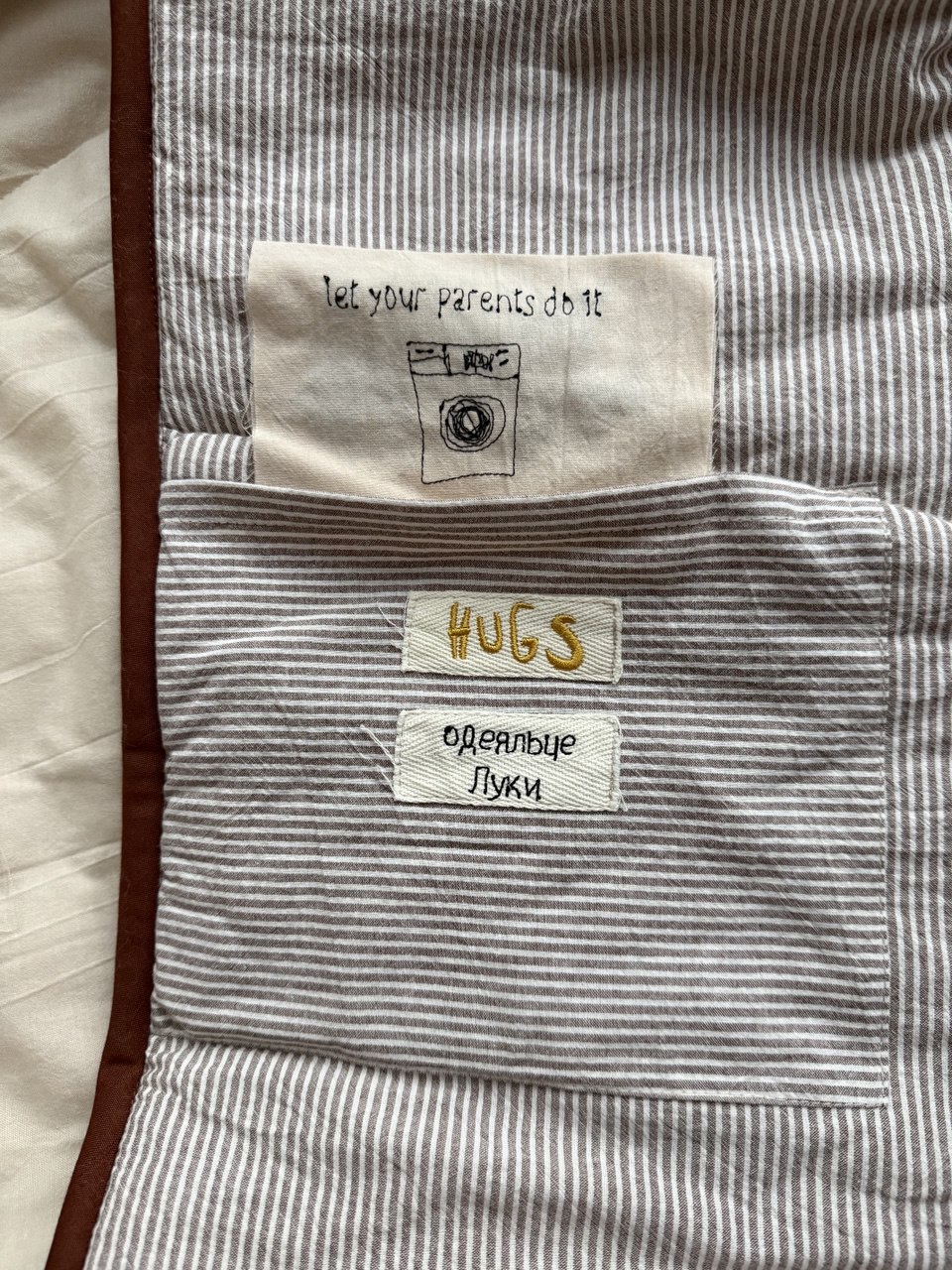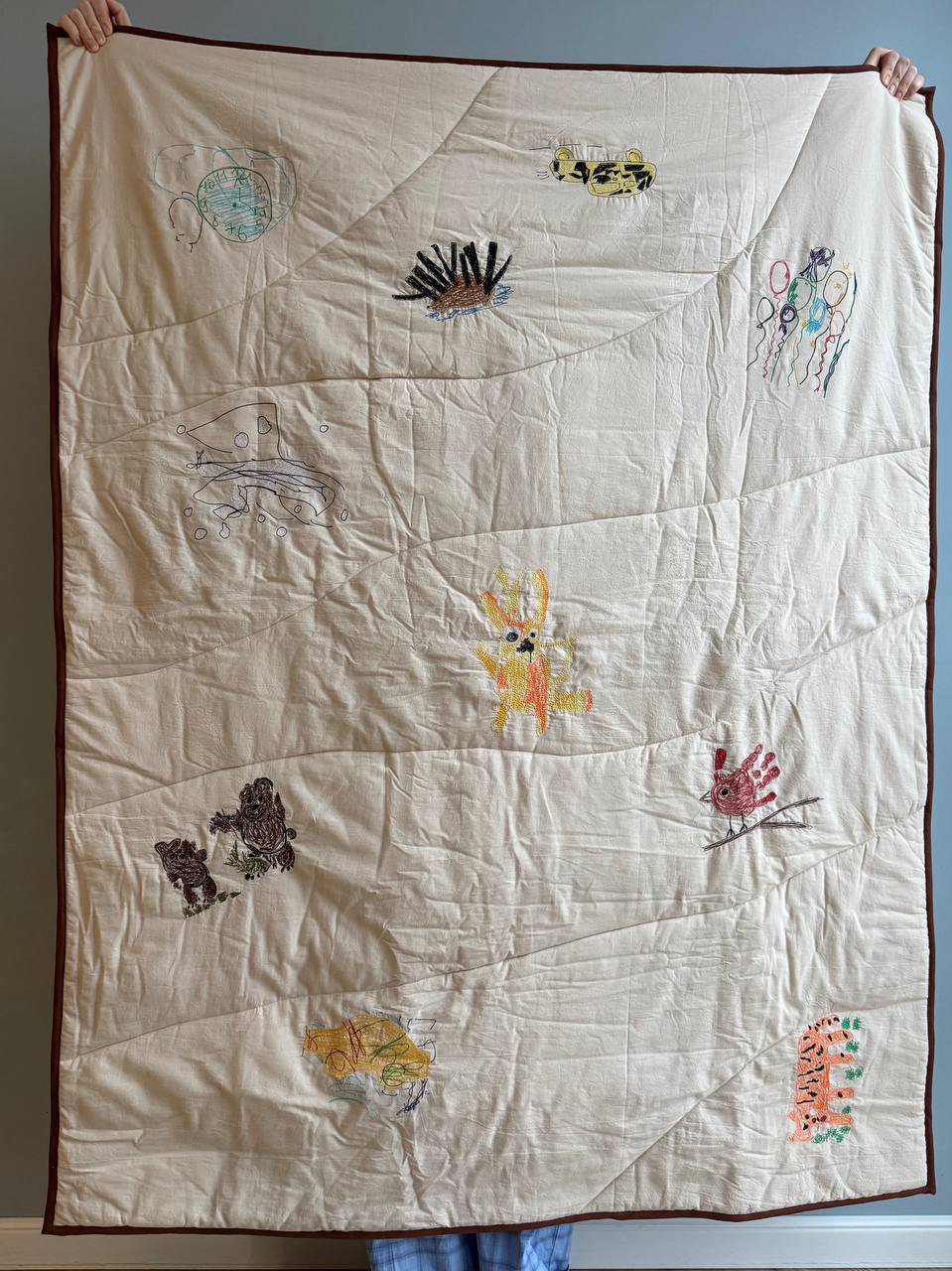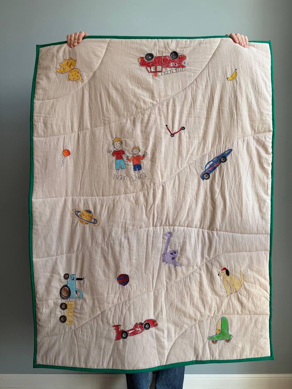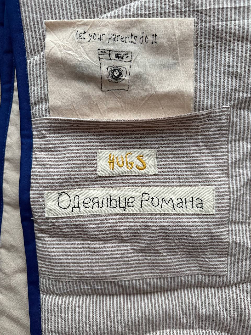 Так и родилась идея создать одеяло-плед с историей, в нём: пожелания от близких, рисунки от братьев и сестёр, дедушек и бабушек, послания от родителей — и всё это бережно вышито.